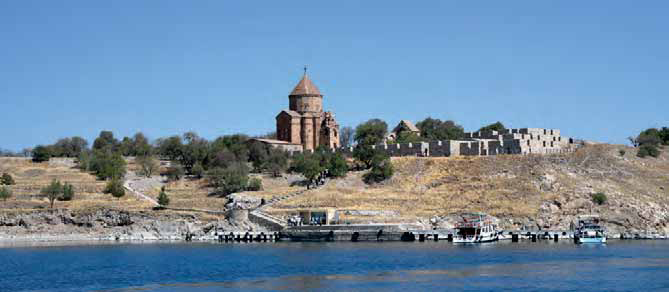 Tarihçede, bu küçük adadaki kentin kuruluşu ayrıntılı olarak anlatılmaktadır. Dikdörtgen bir temel üzerine kurulan sarayda altın yaldızlı kubbeler, görkemli bir dekorasyon ve altın kaplama taht vardır. Akla hayale sığmayacak kadar güzel olan bu sarayın kapıları da çok zarif ve ince işlemelidir. Bu görkemli saraydan günümüze ne yazık ki tek bir iz bile kalmamıştır. Tomas Artsruni, Surp Hatsch Kilisesi, yani Kutsal Haç Kilisesi olarak adlandırdığı kilisenin 915-921 yılları arasında yapıldığına dair kesin bilgiler verir. Yapı malzemesi olarak kullanılan pas rengi kum taşı, prens tarafından Aghznikh'ten (Bugünkü Diyarbakır'ın kuzeydoğusu) getirtilmiştir.