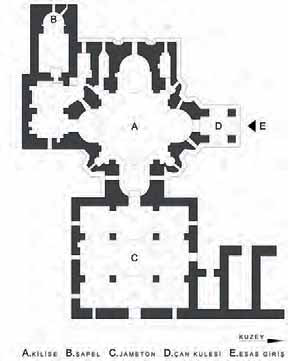 Ortada üstü yüksek bir kubbe ile örtülü kare biçimli bir alan merkezi yapıyı oluşturmakta, onun dört bir yanında ise dışa doğru uzanan ve yarım daire şeklinde sonlanan birer mekân bulunmaktadır. Merkezi karenin dört köşesinde ise çeyrek daire şeklinde birer niş eklenmiştir. Doğu yönündeki iki nişten, apsitin iki yanında yer alan ve uzunlamasına birer mekân olan yan odalara geçilmektedir. Muhtemelen ruhban tarafından kullanılan, mukaddes ve kıymetli eşyaların muhafazası için yapılan bu yan odalara hemen hemen benzer tüm kiliselerde rastlanmaktadır. Orijinal yapıda güney, batı ve kuzey nişlerinin içindeki kapılar dışarıya açılmaktadır. Kare formundaki orta mekân, dört ana yöndeki yüksek nişlerin yarım kubbeleri üstüne oturan, içten silindir biçimli, dıştan on altı yüzlü kubbe kasnağı üzerine oturan konik bir kubbe ile örtülmüştür. Kubbenin tepe noktası 20,40 metre yüksekliğindedir. Kubbenin bulunduğu kasnağın kilisenin yatay boyutu ile orantısız yükselişi, Ermeni Kiliselerinin sıkça görülen bir özelliği olup, orta bölümdeki kare mekânın dışarıdan vurgulanmasını sağlamaktadır.