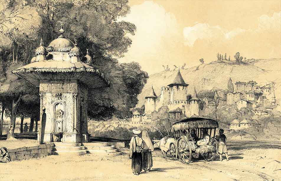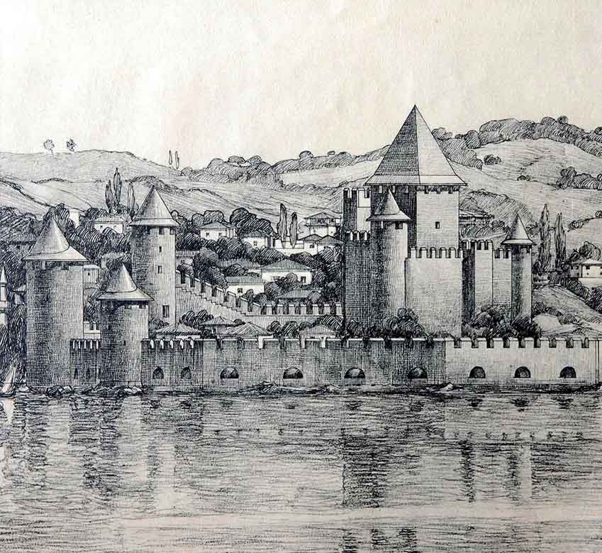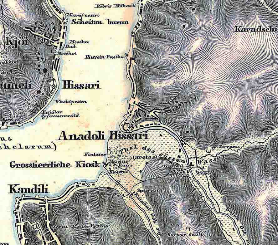 “… Türklerin Göksu, yani yeşil su dediği Areai Deresi doğudan batıya doğru ilerleyerek Neokastron yakınında denize dökülür… Derenin ağzından, sağ yan boyunca ilerleyenler, Sultan’ın sık meyve ağaçlarıyla gölgelenen çok güzel ve çok büyük bahçesini görürler; solda ise Neokastron vardır, Asya’da Boğaz’ın su geçidini daraltır…”
