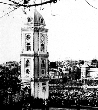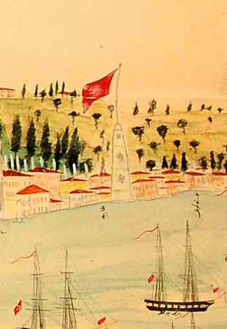Bu çizimin en sağında, üç katlı, yukarı doğru incelen, silindirik gövdeli bir kule ve üzerinde dalgalanan ortasında büyük, dört köşesinde küçük birer şemse olan kırmızı renkli sancak görülmektedir. Aynı kulenin Flandin ve Brindesi tarafından çizilen gravürlerinde üç katlı olarak çizilmelerine karşın, en altta kare kaideli bir bölümün daha olduğu görülmektedir. Tophane Kulesi’ne nazaran çok daha farklı bir mimarisi olan bu kulenin pencereleri yoktur. Bu kulenin en çarpıcı görüntüsüne ise Mıgırdıç Melkon tarafından yapılan bir çekmecenin üzerinde rastlamaktayız. Ahmet Lûtfî Efendi’nin bahsettiği Kuzguncuk Kulesi’nden bir görüntü bulamadık, ancak 1845 tarihli Mühendishane-i Hümayun Haritası’nda Nakkaşburnu civarında bir kule olduğu kayıtlıdır.