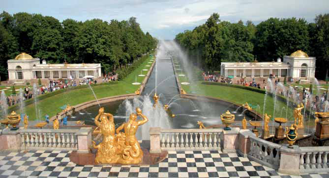 Bronzdan yapılma yaldızlı heykellerin süslediği fıskiyeli havuzlar, havanın soğukluğu nedeniyle çalışmadığından, onların ahenkle gösteri yaptığı ‘beyaz geceler’i aklıma getirmeden duramıyorum. 142 fıskiyenin ve 64 çeşmenin bulunduğu bahçede havuzlar, herhangi bir dış destek almadan ilk yapıldığı günden bu yana birleşik kaplar prensibiyle çalışmaktaymış. Çevreye duyarlı sistemiyle oldukça hoşuma giden bu bahçeyi arkamda bırakıp, sarayın içine doğru tarihi bir yolcuğu çıkıyorum.