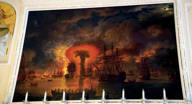 Peterhof Sarayı, altın varaklı salonlar, Çin’den getirilen ipek perdeler ile Türk divanlarının yer aldığı konuk odaları ve sanat eserleri ile donatılmış. Büyük tabloların bulunduğu odayı incelerken Çeşme Deniz Muharebesi’ne ait tablolar dikkatimi çekiyor. Osmanlı Donanması’nın yenilgisi son derece dokunaklı resmedilmiş. Nazi işgali sırasında sarayın, askeri bir üs olarak kullanılıp oldukça yağmalandığını öğreniyorum. Bu dönemde St. Petersburg’a 250 binden fazla bomba düşmüş ama hayat hiçbir zaman durmamış. Üç üniversite eğitimine devam etmiş, dört tiyatro ve yirmiden fazla radyo istasyonu da faaliyetlerini sürdürmüşler. Sanatın ve ilmin açlık sınırıyla baş başa olan bu insanlar tarafından sürdürülmesi ruhu ve zihni doyurmanın önemini bir kez daha bana hatırlatıyor.