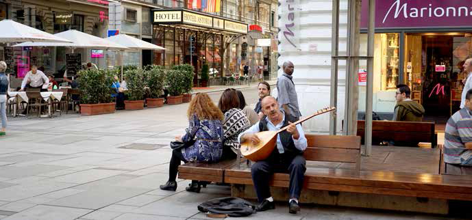 1679’daki büyük veba salgınında hayatını kaybedenler anısına dikilmiş olan ve Avusturya’nın birçok şehrinde benzerlerine rastlayabileceğiniz Veba Anıtı’nın da bulunduğu Graben Caddesi’ne doğru yürüyoruz. Viyana’nın simgelerinden olan anıtın yanında alışveriş mağazaları, butikler, restoranlar ve sokak sanatçılarının bulunduğu caddede tanıdık ezgiler çalınıyor kulağımıza bir ara. Sese yönelince Anadolu’nun bağrından kopmuş gurbetçi bir vatandaşımızın banka oturmuş, bağlama çalarak türkü söylediğini görüyoruz. Önce şaşırıyor sonra gülümsüyoruz bu manzaraya. Keyifle eşlik ediyoruz memleketimizin türküsüne biz de. Yüzümüzde kalan tebessümle devam ediyoruz yolumuza.